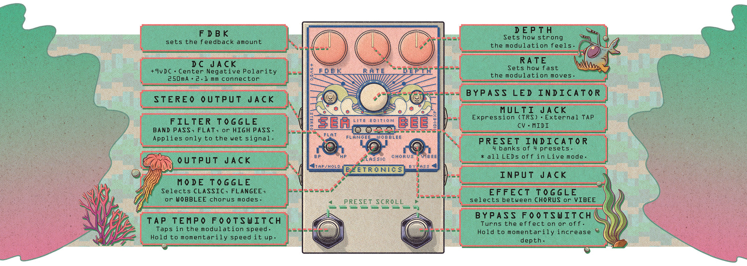 The Seabee Lite takes a different approach. It focuses on great, classic-style chorus sounds, with a simpler and more immediate workflow. No harmonizing modes, no deep diving, just dial it in and play.